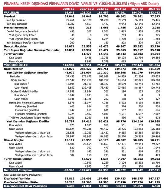 Ancak asıl hikaye toplam rakamda değil, bilançoların "karanlık odasında" yani reel sektörün borcunun bir yılda 45 milyar dolar artarak 298 milyar dolara çıkmasında. Sadece özel borcun artması değil, asıl sorun döviz açık pozisyonunda saklı.