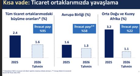 Grafikler alarm veriyor: 2025 yılında dünya ekonomisi %3.4 büyürken, Türkiye’nin ana pazarlarındaki büyüme sadece %2.4’te kaldı. 2026 tahmini ise daha vahim; küresel büyümenin %3.1’e gerilemesi beklenirken, bizim en büyük pazarımız olan Avrupa Birliği’ndeki büyüme tahmini %1.3, Orta Doğu ve Kuzey Afrika’da ise %1.1. Hatta Türkiye’nin mal ve hizmet ihracatının yüzde 95’ini oluşturan pazarlarda büyüme yüzde 1,6 bekleniyor.
