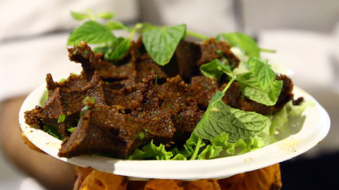 İşte o zamanlardan bir gün bir avcı ava çıktı, bir ceylan çıktı yoluna, elindeki mızrakla ceylanı vurdu. Kimselere görünmeden de ceylanı sırtlayıp eve getirdi. Çocuklar sevindi, kursaklarından et geçecekti. Ama odun yok, bulunsa da ateş yakmak yasak. İnsanoğlu çaresizlikten çare üreten yaratıktır. İşte o sırada avcının karısının aklına bir fikir geldi. Ceylanın kol kısmından sinirsiz, yağsız bir parça lup et kopardı. Eti bir taşın üzerine koydu, başka bir taşla eti dövmeye başladı. Et iyice kıyılınca koydu toprak kaba. Verdi içine bir miktar bulguru, biber ezmesini, isotu, tuzu, yoğurdukça yoğurdu, köfte kıvamını alınca içine taze soğan, maydanoz kattı, koydu yemek bekleyen kocasının ve çocuklarının önüne.