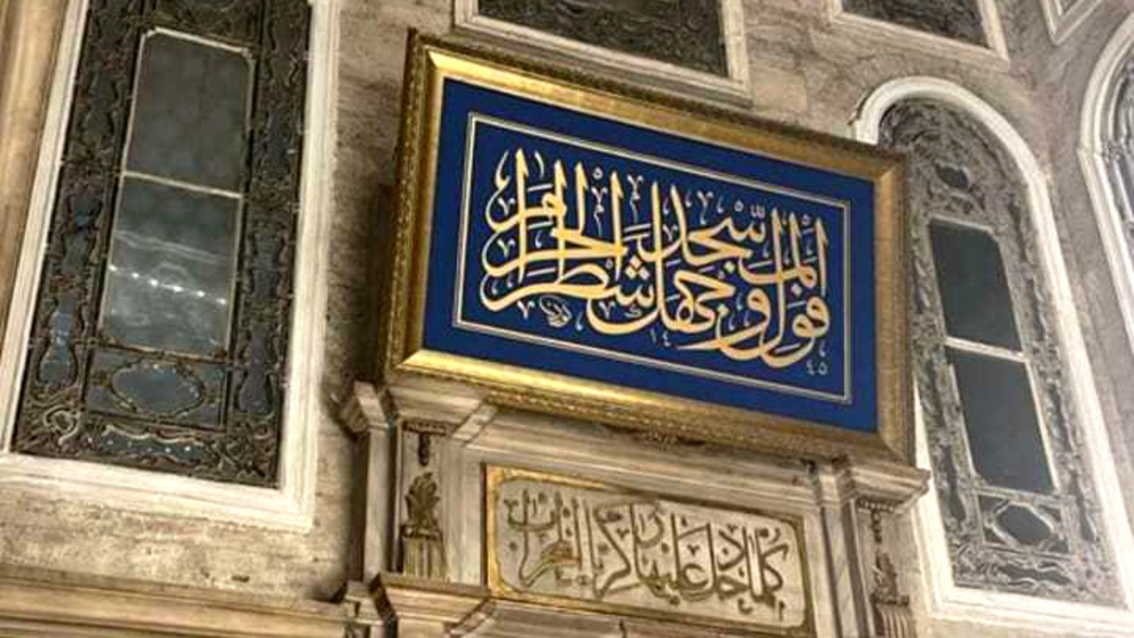 Geçen hafta mihrabın işte bu kısmı kapatıldı ve papaza benzediği iddia edilen barok alınlık ile hattın üzerine yeni yazdırılan masmavi bir hat levhası yerleştirildi, levhayı yazan kişi de marifetini “San’ata atılan imza” diye sosyal medya hesabında paylaştı!