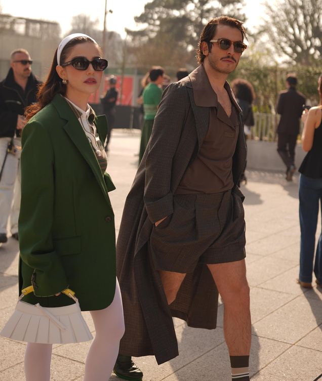 Boran Kuzum'un ise dikkat çeken kombini, koyu kahverengi tonların baskın olduğu; trençkot, polo yakalı üst ve şort formundaki parçalardan oluşuyordu.