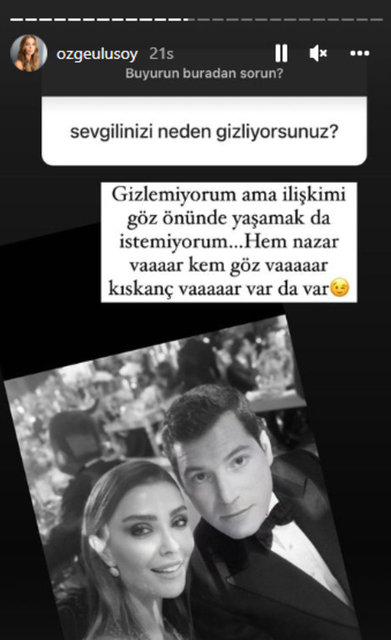 Yaklaşık iki buçuk yıldır Faruk Çolakoğlu ile aşk yaşayan Özge Ulusoy, bir takipçisinin, "Sevgilinizi neden gizliyorsunuz?" sorusuna yanıt verdi