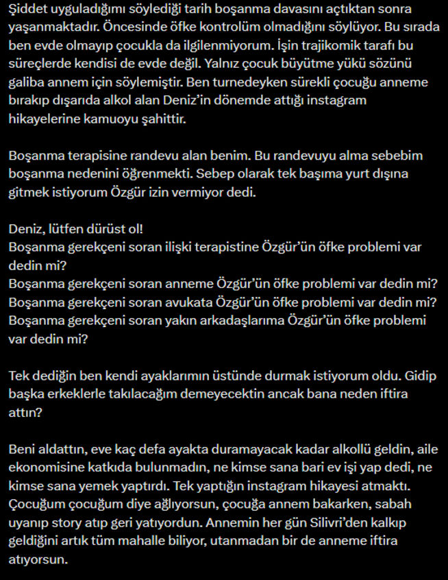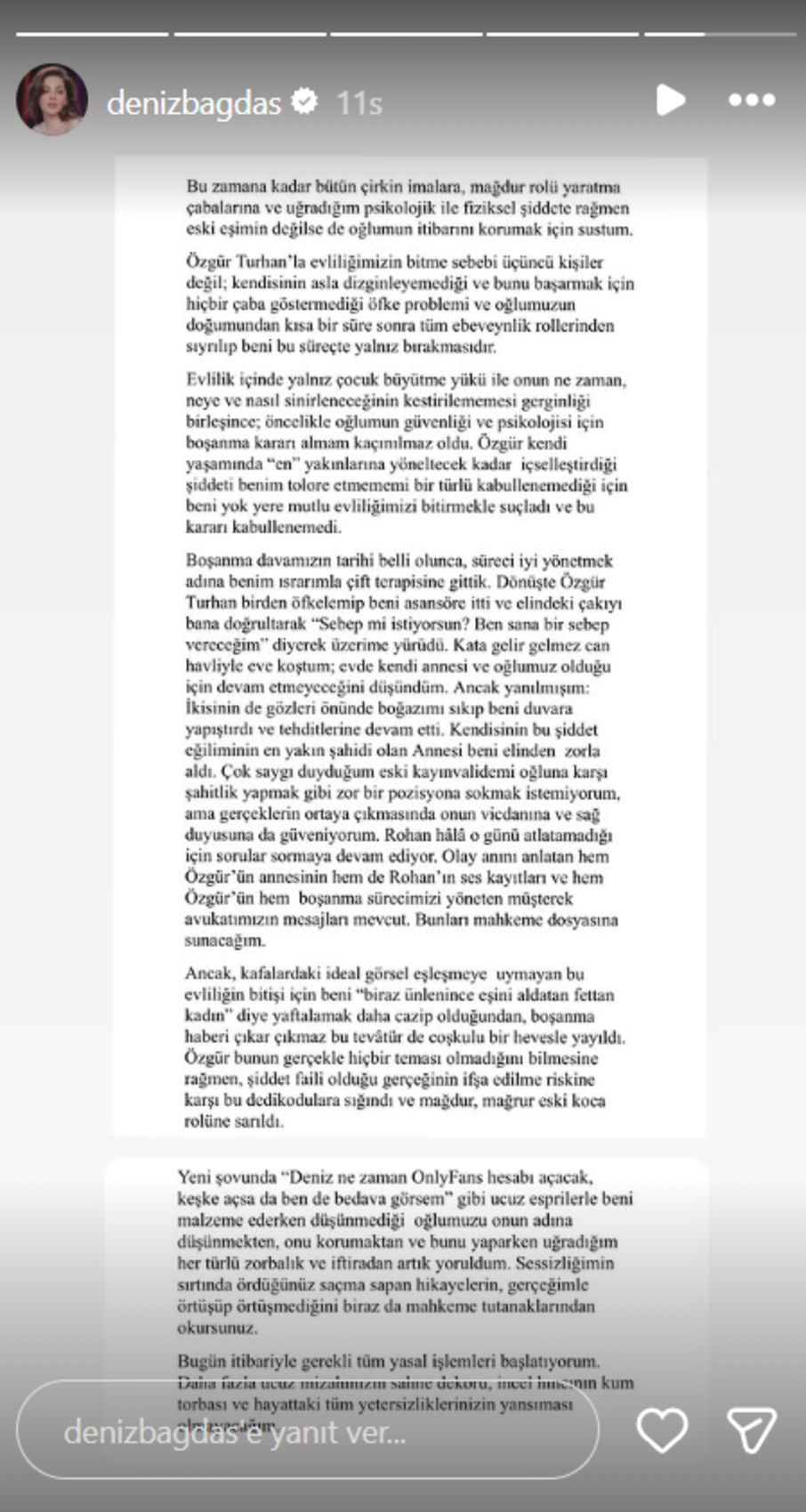 "10 yıllık süre içerisinde kendisine sesimi yükselttiğime dair bir şahit bile bulamaz" diyen Turhan, Deniz Bağdaş’ın kendisini 'şiddet uygulamakla' suçladığını ve bu iddiaların gerçek dışı ve tutarsız olduğunu söyledi. Turhan, boşanma sürecinde avantaj sağlamak amacıyla delil olmadan böyle bir yola başvurulduğunu öne sürdü.