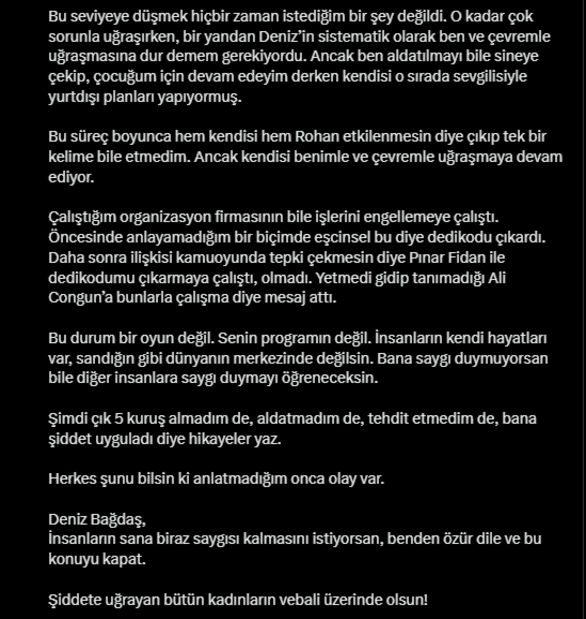 Deniz Bağdaş, eski eşinin kendisine şiddet uyguladığını ve bu şiddeti hem oğlu Rohan hem de kendi annesi önünde gerçekleştirdiğini iddia ederek tüm yasal işlemleri başlattığını duyurmuştu. Bağdaş ayrıca, kendisine yönelik 'aldatan kadın' vurgularından rahatsızlık duyduğunu da belirtmişti.