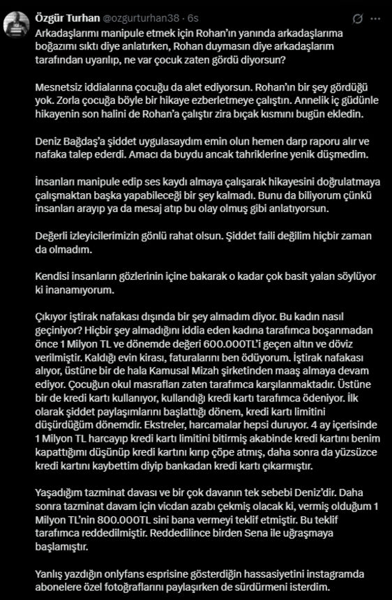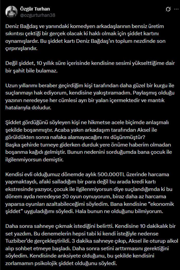 Komedyen Özgür Turhan, eski eşi Deniz Bağdaş'ın kendisine şiddet uyguladığı iddialarını reddetti. Turhan, boşanma sürecinde delil olmadan böyle bir yola başvurulduğunu savunurken, maddi destek sağladığını ve oğulları Rohan'ın bakımının büyük ölçüde kendisi tarafından üstlenildiğini açıkladı