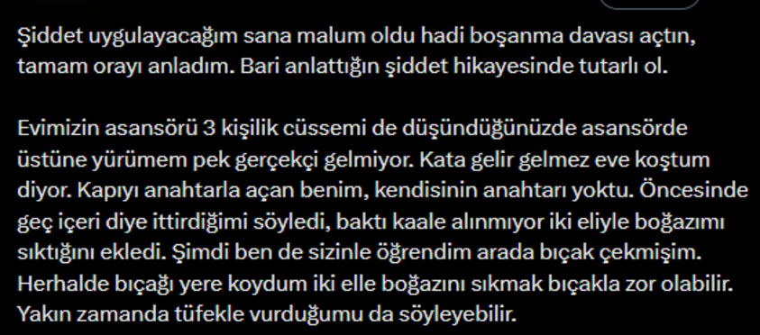 Eski eşinin davranışlarına da değinen Turhan, "Beni aldattın, eve defalarca ayakta duramayacak kadar alkollü geldin, aile ekonomisine katkıda bulunmadın" sözleriyle Bağdaş’ı sadakatsiz ve sorumsuz davranmakla suçladı.