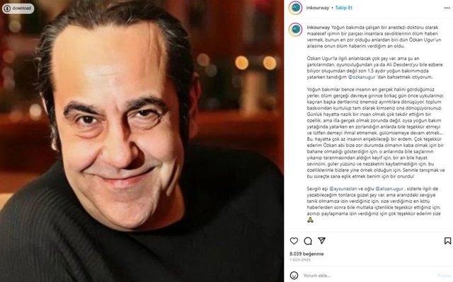 “Yoğun bakımda çalışan bir anestezi doktoru olarak maalesef işimin bir parçası insanlara sevdiklerinin ölüm haberi vermek, bunun en zor olduğu anlardan biri dün Özkan Uğur'un ailesine onun ölüm haberini verdiğim an oldu.” diyen Aylin İlksöz paylaşımında “Özkan Uğur’la ilgili anlatılacak çok şey var, ama şu an şarkılarından, oyunculuğundan ya da Ali Desidero'yu bile ezbere biliyor oluşumdan değil son 1.5 aydır yoğun bakımımızda yatarken tanıdığım Özkan Uğur 'dan bahsetmek istiyorum.