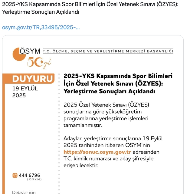 2025 Özel Yetenek Sınavı (ÖZYES) sonuçlarına göre yükseköğretim programlarına yerleştirme işlemleri tamamlanmıştır.