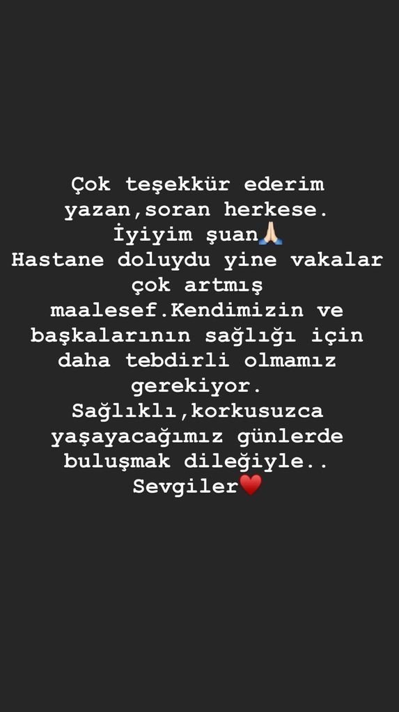 Konuyla alakalı Instagram'dan paylaşımda bulunan ünlü oyuncu, "Çok teşekkür ederim yazan, soran herkese. İyiyim şu an. Hastane doluydu, yine vakalar çok artmış maalesef." şeklinde konuştu.