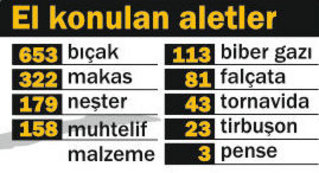 Çağlayan'daki İstanbul Adalet Sarayı güvenlik kontrol noktasında, 10 ay içerisinde ele geçirilen ve önceki gün sergilenen suç aletleri dudak uçaklattı. Sergilenen 1575 malzemenin içinde neler yoktu ki? Bıçak, çatal, biber gazı, makas, kalem görünümlü bıçak, tirbuşon, tornavida, pense, neşter, falçata... İstanbul Cumhuriyet Başsavcısı Turan Çolakkadı, ele geçirilen aletlerin vatandaşlardan zorla alınmadığını söyledi: “Bina girişinde suç teşkil eden bir eşyayı özel güvenlik teşkilatı bulduğu zaman polise teslim ediyor. Soruşturma başlatılıyor. Suç teşkil etmeyecek eşyaları ise alıkoyuyor. Suç olmasa bile içeride tehlike oluşturabilecek çakı, makas gibi aletler de alınıyor. Görevliler, binaya bu aletlerle girilemeyeceğini belirtiyor. Onlar da gönüllü bırakıyorlar. Bu eşyalar unutulan eşyalardır. 1575 adet aletin yarısı suç teşkil ettiği için polise teslim edilmiştir.’’ Peki, vatandaşlar adliyeye giderken yanlarında neden bıçak, makas, tornavida hatta biber gazı taşıyor? Adliye binalarında yaşanan adli olaylar mı bu durumu tetikliyor?