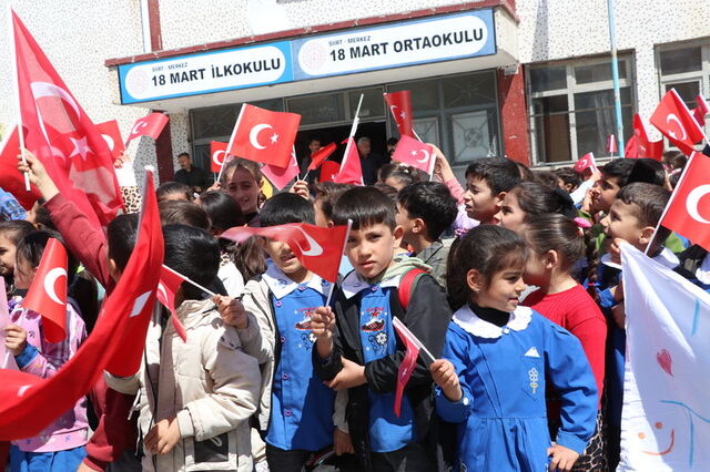 Merkez 18 Mart İlk ve Ortaokulu bahçesinde düzenlenen etkinliğe katılan İl Emniyet Müdürü Necmettin Öztürk ile AK Parti Siirt İl Başkanı Bahri Caner Özturan, öğrencilerle sohbet etti.