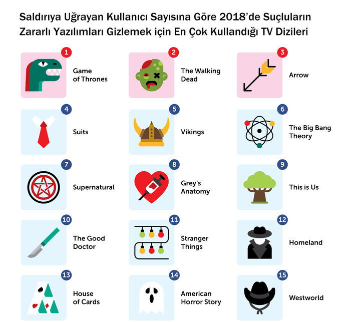 Her iki yılda da listenin başında Game of Thrones (Taht Oyunları) yer aldı. 2018’de zararlı yazılım içeren içeriklerin yüzde 17’si (20 bin 934 saldırı) bu dizinin adını taşırken, The Walking Dead ile 18 bin 794 ve Arrow ile 12 bin 163 saldırı düzenlendi.
