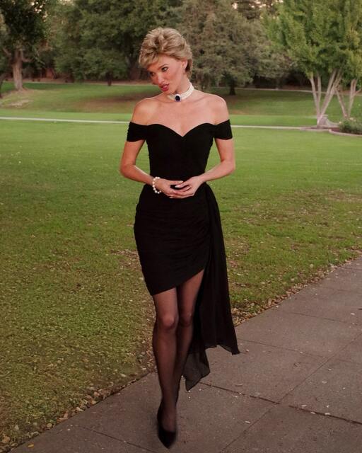 Görünümünü sarı bir perukla tamamlayan ünlü model, fotoğraf çekiminde Diana'nın pozlarını da taklit etti.