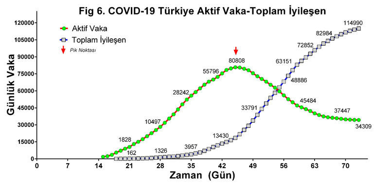 İyileşen hasta sayısı grafiği üzerinden değerlendirmelerde bulunan Prof. Dr. Çetin, "Hastalık ilk çıktıktan yaklaşık 14 gün sonra iyileşen sayımız başlıyor. Başlangıçta yavaş başlıyor, daha sonra hızlı bir şekilde yükseliyor. Bizim için önemli olan tarih 24 Nisan tarihidir. Bu tarih bizim günlük bulduğumuz vaka sayıları ile aynı şekilde iyileşen hasta sayısının çakıştığı tarihtir. Bu halk sağlıkçılar olarak önemli bir noktaydı. Bu tarihten itibaren iyileşen sayısı hızlıca yukarıya çıkmaya başladı" dedi.
