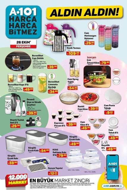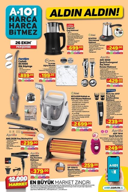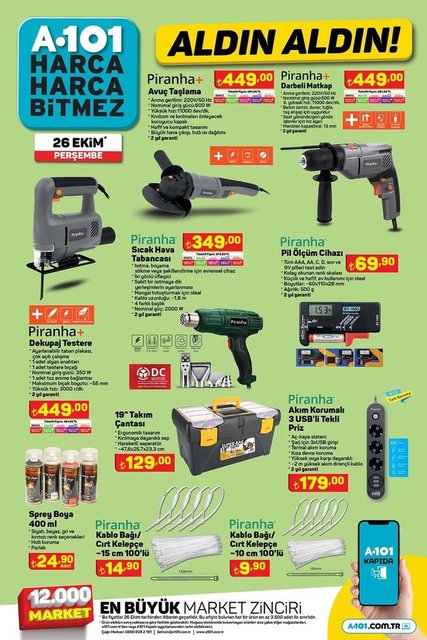 A101 26 Ekim 2023 aktüel ürünler kataloğunda indirimli ürünler kampanyaları bu hafta da devam ediyor. Perşembe Aldın Aldın kataloğunda A101'de 4.0 çekme karavan satışı dikkat çekiyor. Ayrıca Bu haftaki yeni A101 aktüel kataloğunda; çay makinesi, baza başlık seti ve mutfak araç gereçleri de ön plana çıkan ürünler arasında yer alıyor. İşte, 26 Ekim 2023 A101 aktüel indirimli ürünler fiyat listesi...