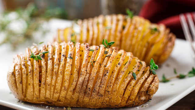 180 derecelik fırındayarım saat kadar pişirin. Ardından patatesleri fırından çıkarıp kalan yağı üzerine fırça ile tekrar sürün ve 15-20 dakika daha fırında pişmeye bırakın. Yelpaze patatesleriniz hazır!