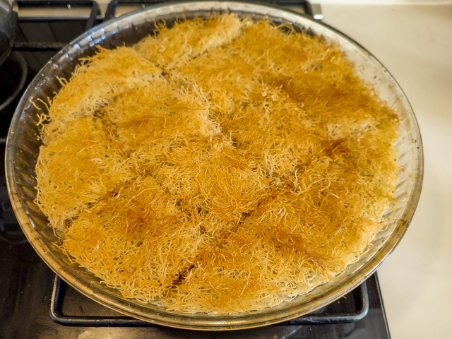 Yağladığınız tepsiye en alt kısmından başlamak üzere bir sıra tel kadayıf bir sıra ceviz veya fındık olacak şekilde yerleştirin. Bu işlemi malzemeniz bitene kadar tekrarlayın. En son katı da kadayıfla kapladıktan sonra, üzerini bir tepsi yardımıyla iyice bastırın.