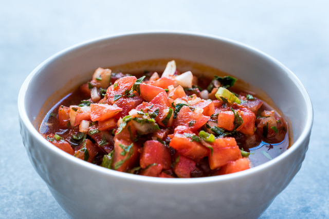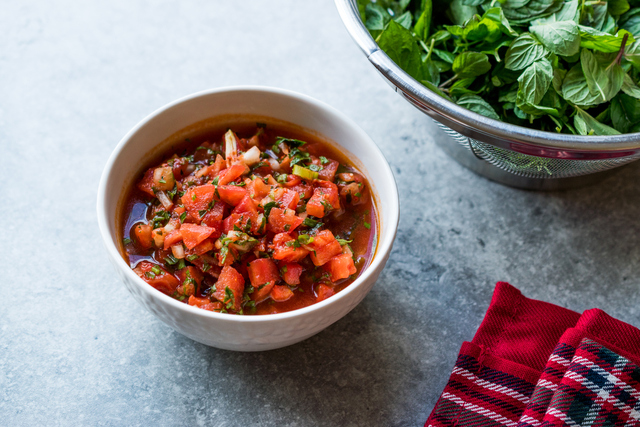 Tüm sos malzemelerini bir kasede iyice karıştırın. Domateslerin kabuklarını soyup 1 tanesini rendeleyin, geri kalanını ise küçük küpler halinde doğrayın. Bu sırada salatalıkları küp şeklinde doğrayın.