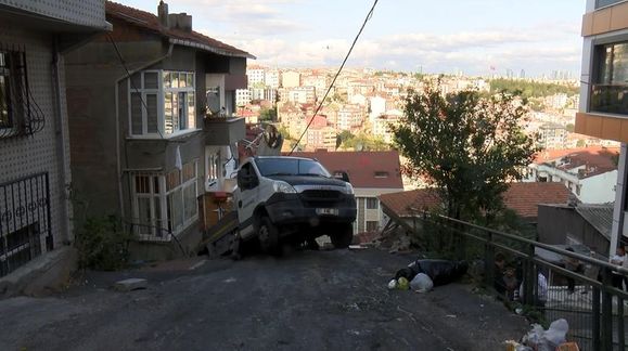 Eyüpsultan'da elektrik bakım onarım çalışması yapan ekibin aracı kontrolden çıkarak yokuştan aşağı kayarken, park halindeki hafif ticari aracı istinat duvarından aşağı düşürdü. Hafif ticari aracın düştüğü yerde bulunan kadın, yanındaki çocuğunu da çekerek son anda kaçabildi. Aracın asılı kaldığı apartman sakinlerinden Melahat Çürgüç, "Biz fen işlerine kaç kere şikayetçi olduk ama burayı yapmadılar. Ben kapıdan çıkacaktım bir dakika önce çıksaydım araba kafama geliyordu. Bu yolu Büyükşehir yapmadı. Çoluk çocuğun kafasına taşlar geliyor. Bu yolu yapmak zorundalar. Fen işlerine o kadar şikayetçi olduk bize kulak asmadılar" diye konuştu.