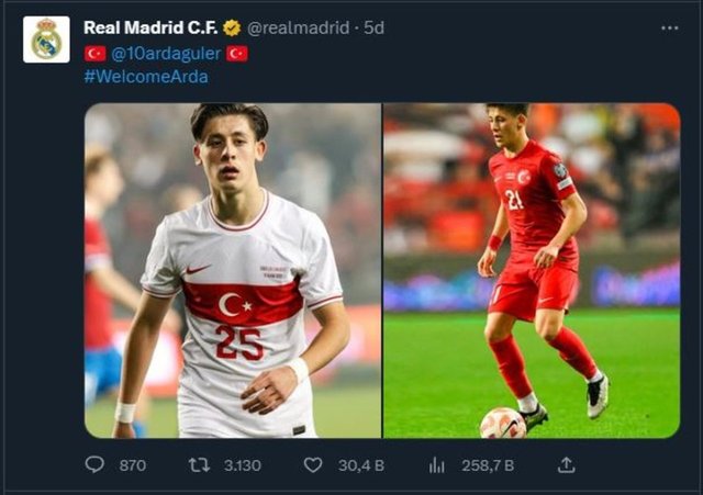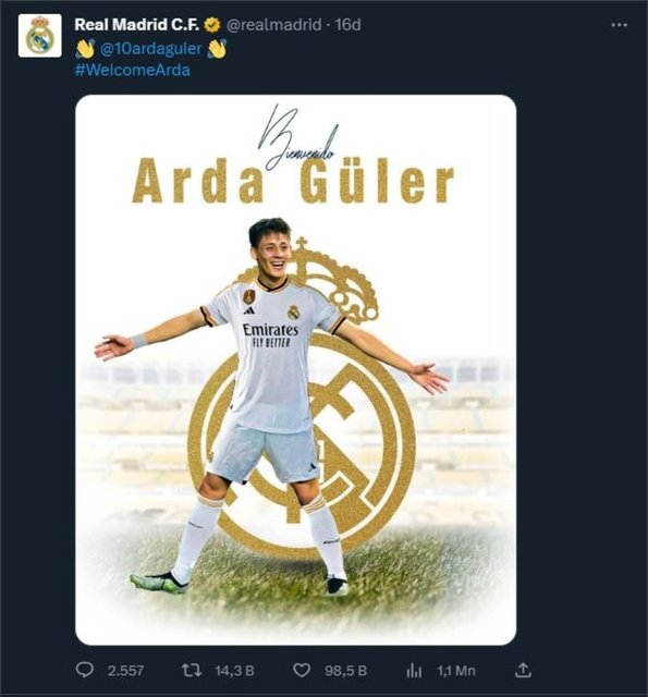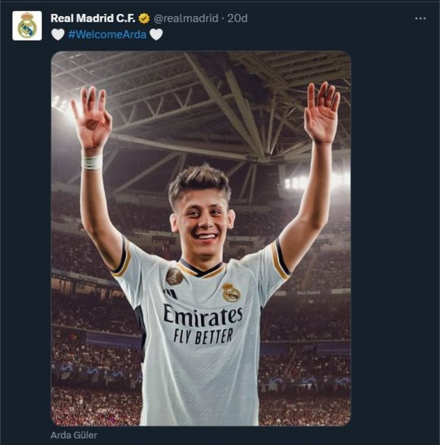 Dünya devi Real Madrid, Fenerbahçe'den Arda Güler'i transfer ettiğini resmen açıkladı. İspanyol ekibi, Türkçe mesajla ilk duyuruyu yaparken paylaşımlar binlerce etkileşim aldı