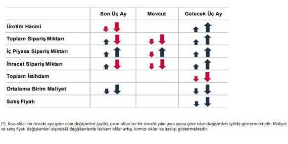 Son üç aya yönelik değerlendirmelerde, üretim hacminde artış bildirenler lehine olan seyrin bir önceki aya göre zayıfladığı, iç piyasa sipariş miktarında artış bildirenler lehine olan seyrin bir önceki aya göre güçlendiği gözlemlendi. İhracat sipariş miktarında azalış bildirenler lehine olan seyrin ise artış bildirenler lehine döndüğü görülmedi.