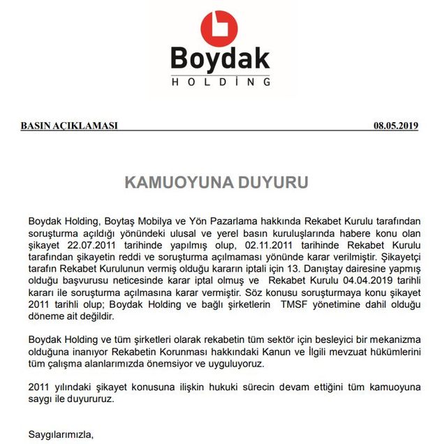 Yapılan açıklamada ayrıca, "Boydak Holding ve tüm şirketleri olarak rekabetin tüm sektör için besleyici bir mekanizma olduğuna inanıyor Rekabetin Korunması hakkındaki Kanun ve İlgili mevzuat hükümlerini tüm çalışma alanlarımızda önemsiyor ve uyguluyoruz. 2011 yılındaki şikayet konusuna ilişkin hukuki sürecin devam ettiğini tüm kamuoyuna saygı ile duyururuz." ifadeleri kullanıldı
