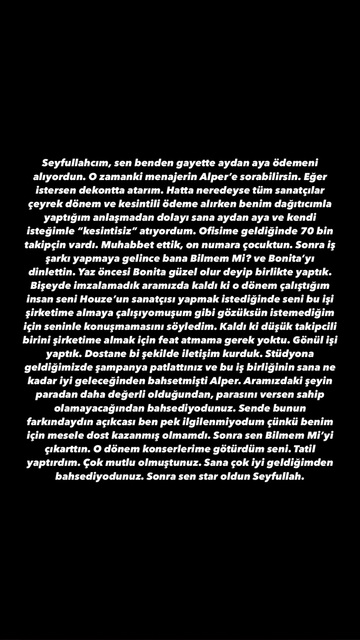 Yaz öncesi 'Bonita'yı birlikte yaptık. Aramızda yazılı bir anlaşma yoktu, sadece sözlü bir anlaşma yaptık. Düşük takipçili birini şirketime almak için feat atmama gerek yoktu; gönül işi yaptık. Stüdyoya geldiğimizde şampanya patlattınız ve bu iş birliğinin sana iyi geleceğinden bahsetmiştik. Aramızdaki şeyin paradan daha değerli olduğunu biliyordun. Benim için mesele dost kazanmaktı. Sonra 'Bilmem Mi'yi çıkarttın, konserlerime götürdüm seni ve tatil yaptırdım. Çok mutlu oldunuz. Sonunda sen star oldun, Seyfullah.