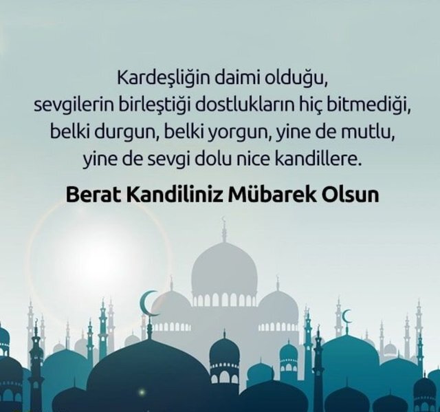 Her sabah güneşle doğan umutlar, her yeni bahar ile tazelenen mutluluklar ve açan her yeni çiçekte gizlenen güzellikler sizinle olsun. Berat Kandiliniz mübarek olsun.