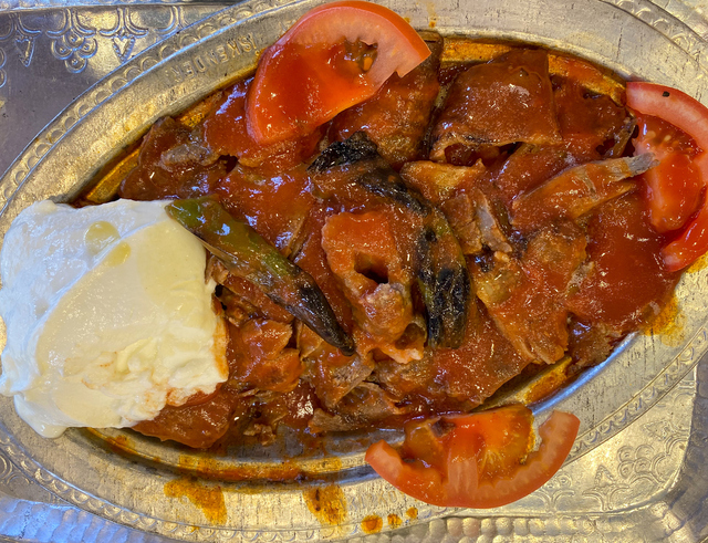 Tabağın bir kenarına yoğurt koyulur. Bu arada; dilerseniz yoğurdu, pide ve sosların üzerine yayıp, üstünü et ile kaplayabilirsiniz. Etlerin üzerine yine sostan koyup, kızdırılan tereyağı da dökülür. Dilerseniz domates, biber ve patates kızartması ile süsleyebilirsiniz. Afiyet olsun!