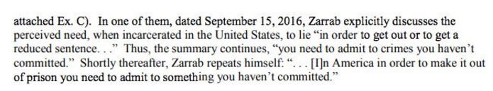 Savunma avukatlarının sunduğu mektupta, 15 Eylül 2016'da Zarrab ile Ahad isimli bir kişi arasında geçen telefon konuşmasında Zarrab'ın "ABD'de hapishaneden çıkmak ya da daha az ceza almak için işlemediğin suçları kabul etmek zorundasın" dediği belirtildi.