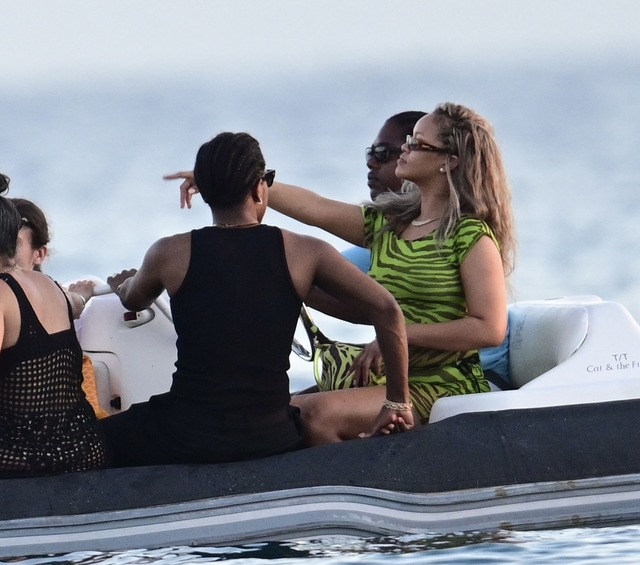 Yeşil renkli hayvan desenli mini elbiseyle ada şıklığı sergileyen Rihanna, lüks yatta sevgilisiyle güneşin batışını izledikten sonra botla kıyıya çıktı.
