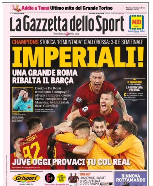 La Stampa, “Tarihi atılım. Bir mucize olması gerekiyordu ve o mucize gerçekleşti” derken, Corriere Della Sera ise “Dzeko, De Rossi ve Manolas imkansızı gerçekleştirdi” manşetiyle haberi okuyucularıyla paylaştı.