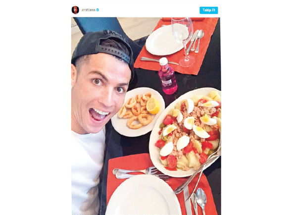 Yıldız futbolcunun öğle yemeği tercihi balık. Akşamları ise ızgara tavuk veya kırmızı et yiyor ve öğünlerinde şekerli yiyeceklerden uzak duruyor. Yine de Ronaldo’nun zindeliğinin asıl sebebi, yediklerinden çok bunları eritecek yoğunlukta spor yapması. Antrenmalarına en az bir saat önce gidiyor ve tek başına güçlendirme egzersizleri yapıyor.