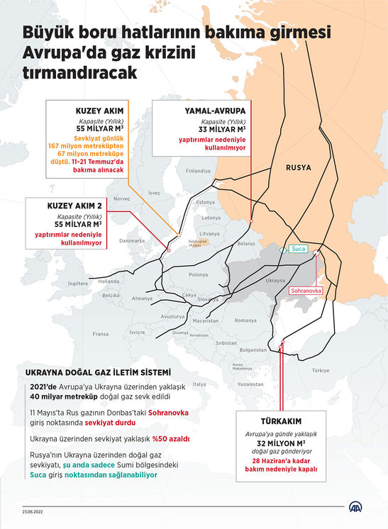 Rusya'nın Kuzey Akım 1 ve TürkAkım boru hatları üzerinden Avrupa'ya gönderdiği doğal gaz miktarı, yapılan resmi açıklamalara göre planlı bakım çalışmaları nedeniyle azalmaya devam edecek. Bu esnada enerji alanında Rus gazına alternatif arayan Avrupa ülkeleri ülkelerindeki üretimi artırma kararı alırken, limanlardaki kömür stokları da 2.5 yılın zirvesine ulaştı