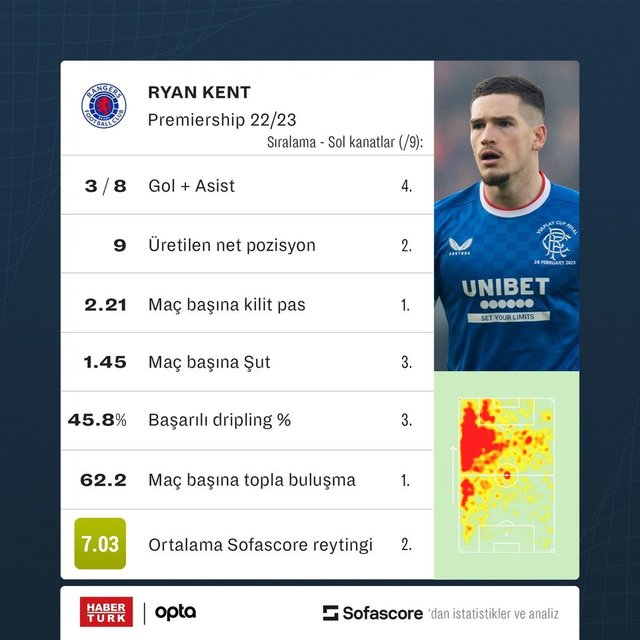 "Ryan Kent, Rangers kariyerine başarılı bir başlangıç yaptı ve ikinci sezonu öncesinde kalıcı bir transfer yapmadan önce Liverpool'dan kiralık olarak geldi. Steven Gerrard'ın yönetimi altında başarılı oldu. Rangers'ın Premiership (İskoçya şampiyonluğu) unvanını kazanmasına yardımcı oldu ve ezeli rakipleri Celtic'in arka arkaya 10 şampiyonluk kazanmasını engelledi, bu yeni bir rekor olabilirdi.