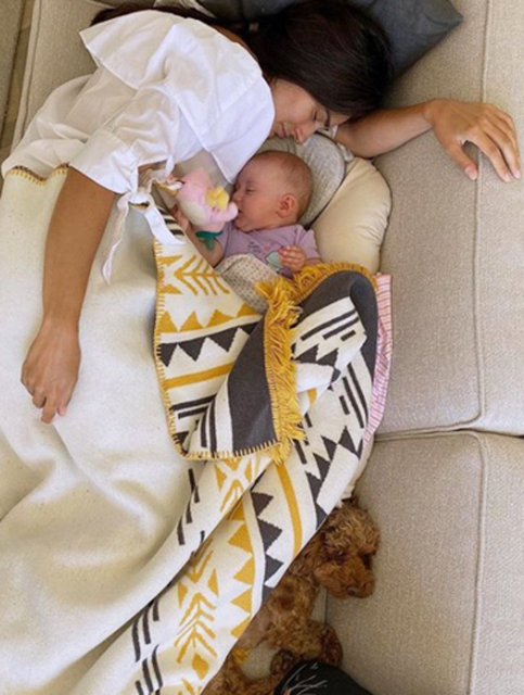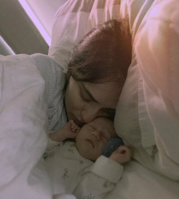 Bu kez, köpeği Kaju ve bebeği ile uyurken çekilen fotoğrafını yayınlayan 36 yaşındaki oyuncu, altına şu notu düştü: