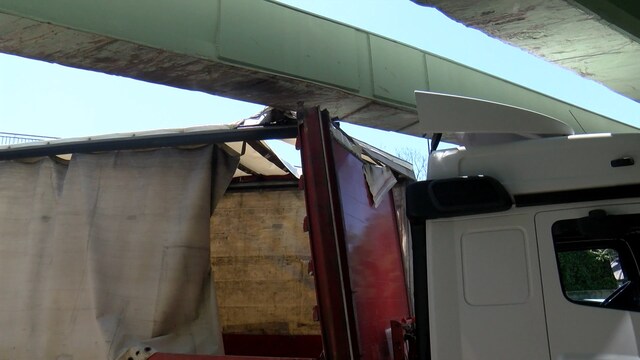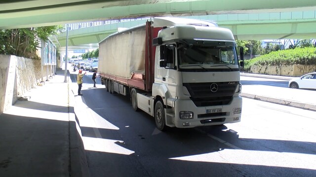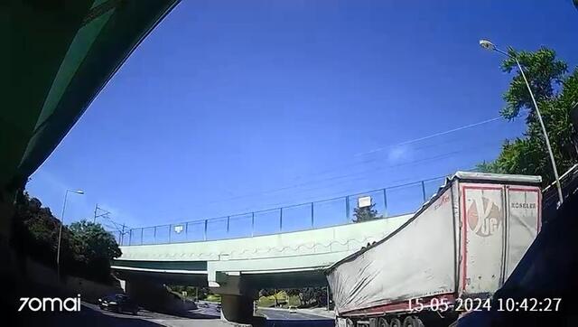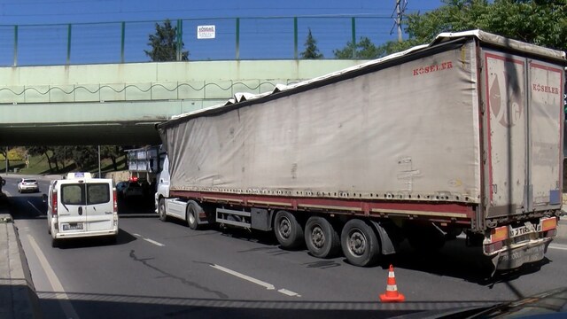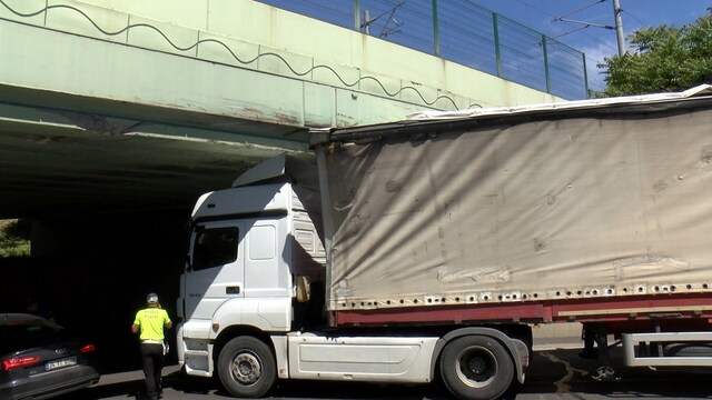 İddiaya göre, TIR'ın şoförü uyarı levhalarını dikkate almayıp geçmek isteyince aracın dorsesi üst geçide çarptı.