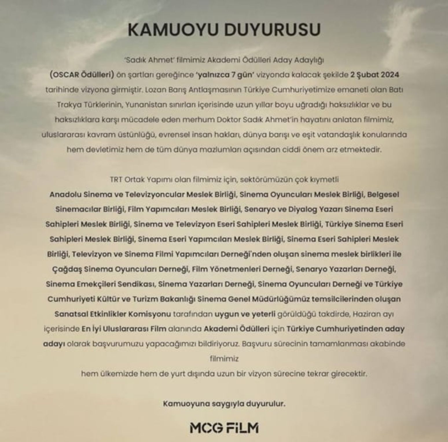 Gösterime cuma günü giren 'Sadık Ahmet' adlı sinema filmi cuma gününden itibaren gösterimden kaldırılacak. TRT ortak yapımı filmin yapım şirketi MCG Film, bu konuda bir açıklama yaparak gösteriminin sadece bir hafta olacak olması hakkında şunlar belirtildi; "Aşağıdaki duyuru bildirisinde de belirtildiği gibi filmimiz bir hafta süreyle vizyonda kalacak olup 9 Şubat tarihinde vizyondan kalkacaktır. Filmimiz bir hafta vizyonda kalacağı için bu bir haftalık süreç boyunca gerçekleşen seyirci sayıları bir sonraki uzun vizyon sürecindeki izleyici sayılarına dahil edilerek paylaşılacaktır.
