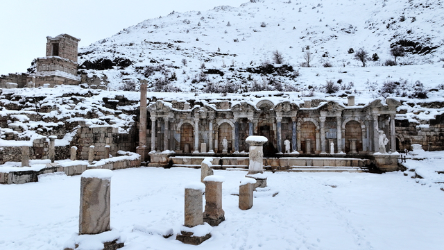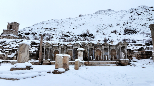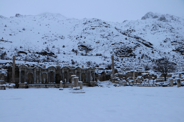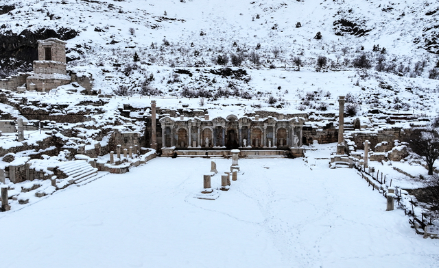Akdağ'ın eteklerinde 1500-1700 rakımda bulunan tarihi alanda Aşıklar Çeşmesi olarak da adlandırılan Antoninler Çeşmesi, etrafındaki onursal sütunlar, zafer takları, agoralar, Roma hamamı, tiyatro, kütüphane ve Heroon yapısı, beyaz örtüyle kaplandı.