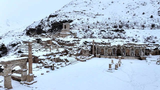 Burdur'un Ağlasun ilçesindeki aşkların ve imparatorların şehri olarak bilinen, ülkenin en yüksek rakımdaki antik kentlerinden Sagalassos, kar yağışının ardından beyaza büründü