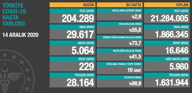 Sağlık Bakanı Fahrettin Koca, 14 Aralık Türkiye Günlük Koronavirüs Tablosu dün yayınlandı.