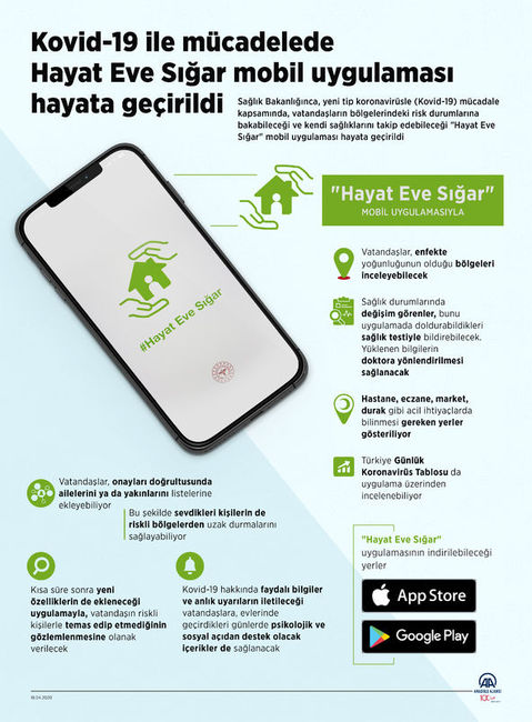 Hayat Eve Sığar uygulaması nasıl indirilir? Nasıl kullanılır? sorusu vatandaşların gündeminde. Sağlık Bakanlığı tarafından hazırlanan, 'Hayat eve sığar mobil uygulaması' Android ve App Store platformlarında yayına başladı. Uygulama, sokakta gezerken koronavirüs testi pozitif olan birisiyle karşılaşan kişiyi mesajla uyarıyor.