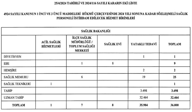 Karar uyarınca 1 diyetisyen, 9 ebe, 2 hemşire, 25 sağlık memuru, 1 sağlık teknikeri, 3 bin 498 tabip, 32 bin 464 de uzman tabip istihdam edilecek.