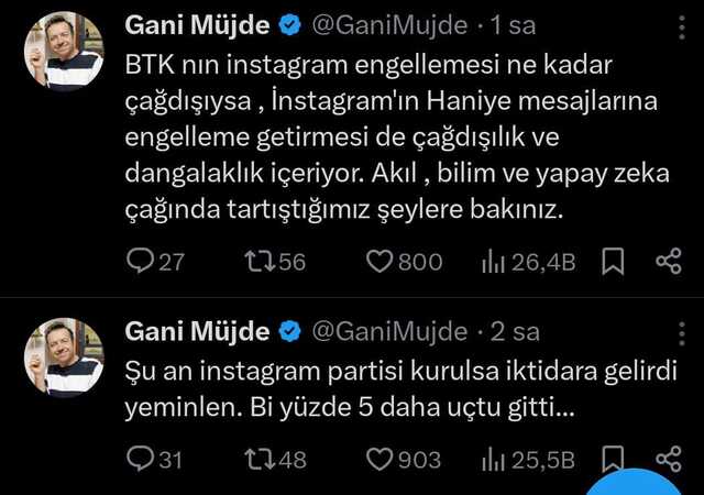 Bilgi Teknolojileri ve İletişim Kurumu tarafından Instagram'a getirilen erişim engeline Şahan Gökbakar, esprili göndermede bulundu. Gani Müjde ise X uygulaması üzerinden Instagram'a getirilen erişim engelli hakkında görüşlerini paylaştı