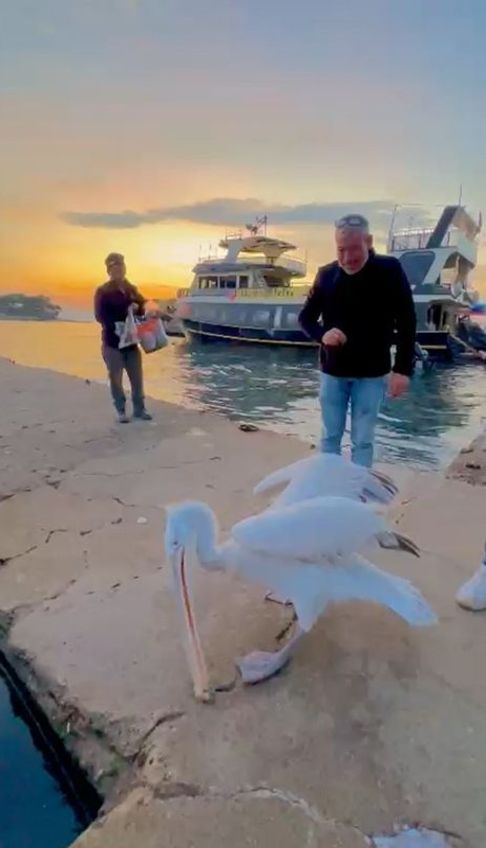 Vatandaşın, "Sinirlenmek yok. Aferin. Kızmak yok, kızmak yok. Öyle sert hareketler yok" diye konuşup, pelikanı karada balıkla beslemeye devam ettiği anlar da görüntüye yansıdı. Pelikan, yere düşen balığı da alıp yedi.