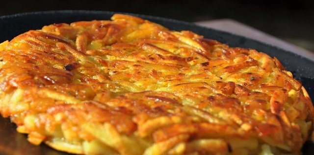 Üzerine biber ve taze soğan karışımı ile kaşar peynirini de ekleyin. Ardından kalan rendelenmiş patatesleri koyup üstünü düzleştirin. Kısık ateşte alt kısmı kızarana kadar pişirdikten sonra röştiyi ters çevirip diğer tarafını pişirin. Pişen röştinizi ocaktan alıp dilimleyerek servis edebilirsiniz. Afiyet olsun!