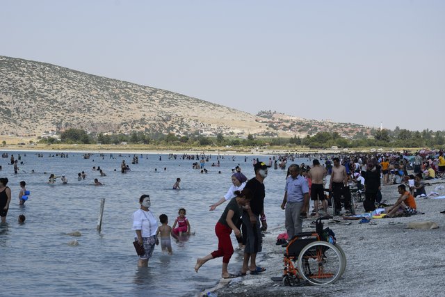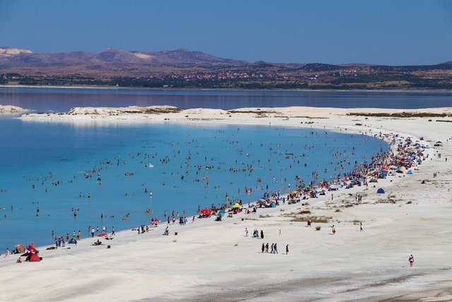 Burdur’da beyaz kumsalı, berrak suyu ve turkuaz rengiyle ‘Türkiye’nin Maldivler’i’ olarak ünlenen Salda Gölü bayramda tatilcilerin akınına uğradı.