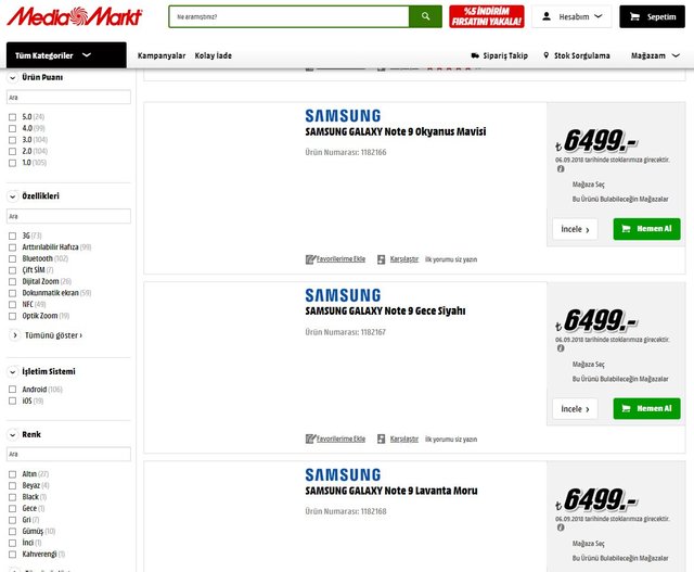 MediaMarkt Türkiye’nin internet sitesine Galaxy Note 9, 6499 TL’den satışa sunulacak. Eğer bir yanlışlık yoksa ürünün Türkiye’deki başlangıç fiyatı da bu olacak. Geçtiğimiz sene 23 Ağustos’ta tanıtılan Galaxy Note 8’in fiyatı ise 4999 TL’ydi ancak zaman içerisinde 5499’a çıkmıştı.