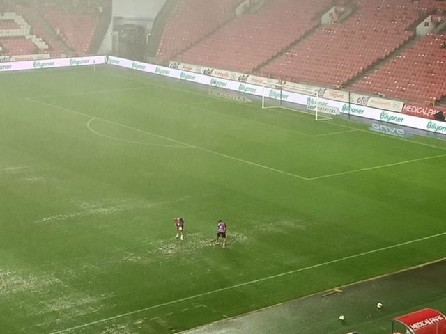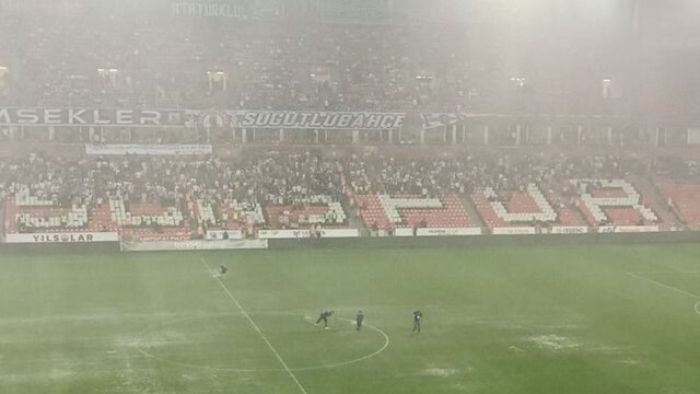 Maçın 12. dakikasında hakem Burak Şeker, iki takımın oyuncularının zeminde topun zıplamadığını söylemesi üzerine karşılaşmayı durdurdu.