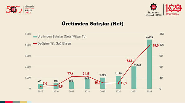 Enflasyon etkisiyle üretimden satışları yüzde 119, karı ise yüzde 121 artan Türkiye'nin en büyük 500 sanayi kuruluşu çalışanlarına 2011'de ortalama 11 bin 500 lira ücret verirken 2022'de yüzde 78 artışla 20 bin 501 lira maaş ödedi. Asgari ücretin 2.324 liradan 5.500 liraya kadar artırıldığı 2022'de yüksek artışa rağmen daha iyi ücret aldığı bilinen sanayi isçisinin ücreti düşük ücret alan diğer çalışanlara göre daha az arttı. Oysa sanayi işçisi şirketlere kişi başı 5.6 milyon liralık üretim yaparken 615 bin lira kar üretti. Faizlerdeki düşüş ile finansman giderlerindeki artış yüzde 33'te kalan şirketlerde özkaynakların payı 29.3'ten yüzde 35.6'ye çıktı. Özkaynaklardaki artış yeniden değerleme uygulaması ve yüksek kardan kaynaklandı. Tüm rakamlarda yüksek oranlı artışlardaki enflasyon etkisine öne süren sanayici ise faaliyet karlılığındaki 2 puanlık azalmaya dikkat çekiyor.